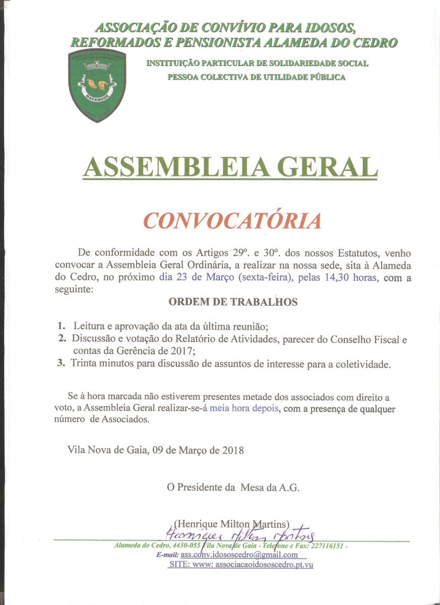 A pedido do Presidente da Mesa da Assembleia Geral, Henrique Milton Martins, convocamos os Associados a se reunir em Assembleia Geral Ordinária no dia 23 de março de 2018, pelas 14h30, na sede da Associação de Convivio para Idosos, Reformados e Pensionistas da Alameda do Cedro, sito na Alameda do Cedro, s/n, Mafamude, Vila Nova de Gaia.